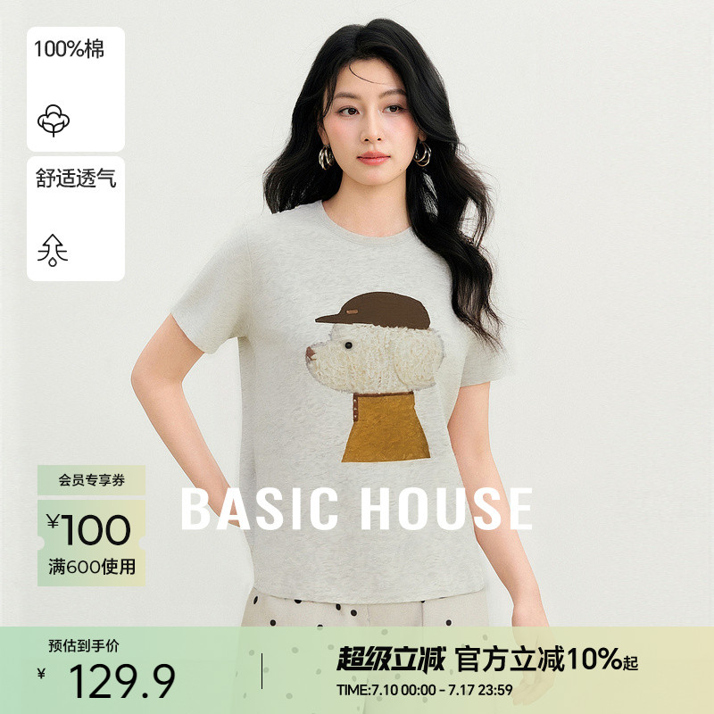 Basic House/百家好小狗圖案短袖T恤女夏季輕薄圓領撞色套頭上衣