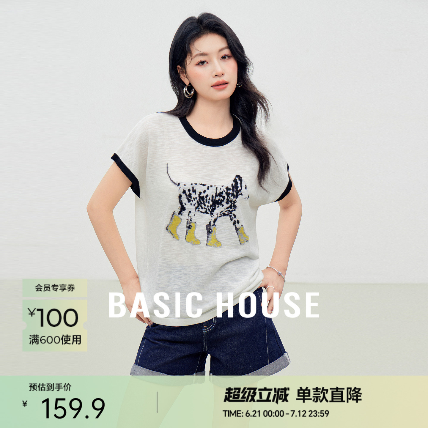 Basic House/百家好撞色小狗刺繡針織衫今年夏季短款高級圓領上衣