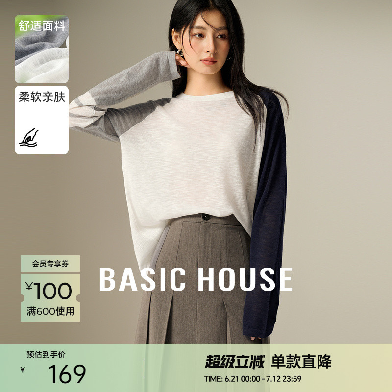 Basic House/百家好復古撞色拼接針織衫春季小眾長袖寬松上衣2025