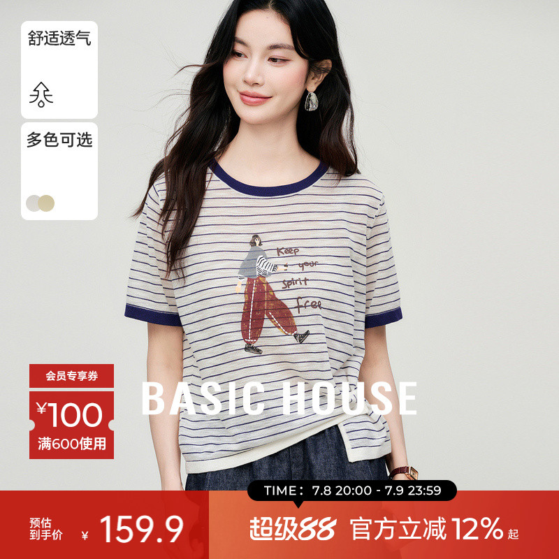 Basic House/百家好條紋短袖針織衫夏季新款個性印花時尚針織衫女
