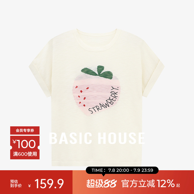 Basic House/百家好圓領薄款短袖針織衫女卡通提花T恤上衣2025夏