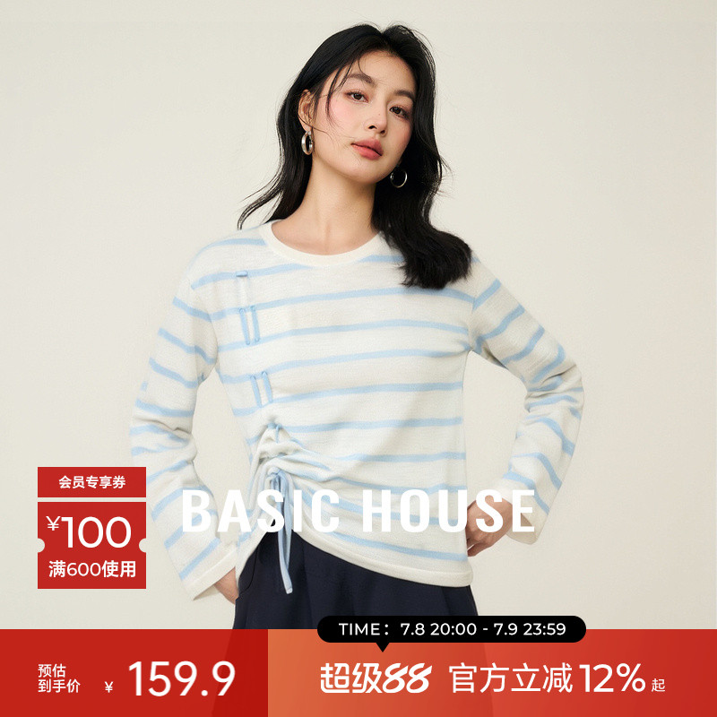 Basic House/百家好航海系條紋側邊抽繩針織衫女夏季輕薄撞色上衣