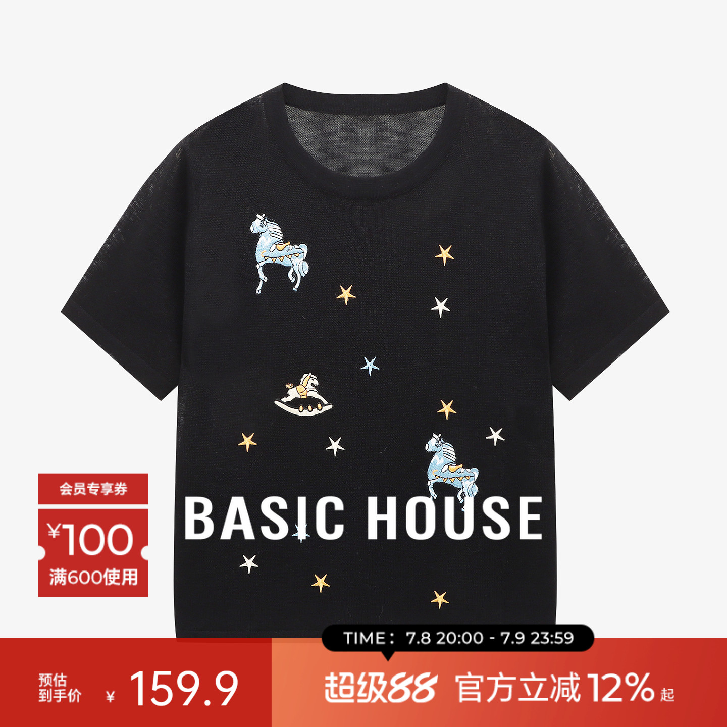 Basic House/百家好卡通刺繡短袖針織衫夏季流行短款純色套頭上衣