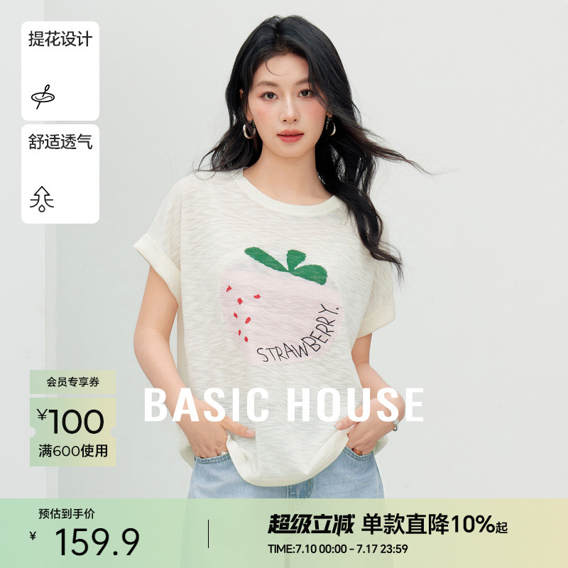 Basic House/百家好圓領薄款短袖針織衫夏季新款卡通提花T恤上衣