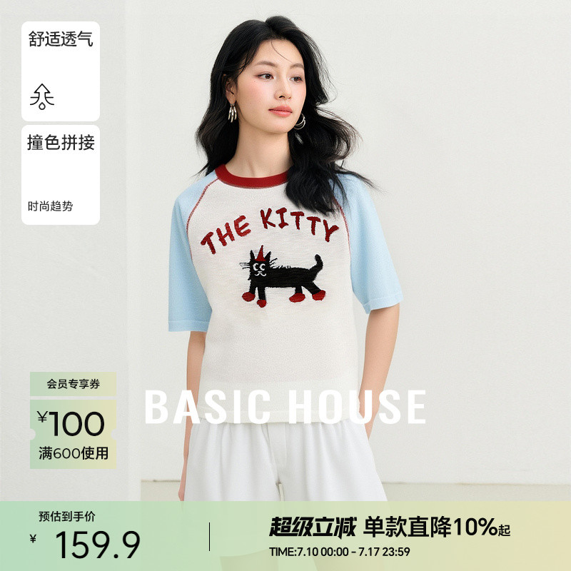 Basic House/百家好美式貓咪提花短袖針織衫夏流行撞色插肩袖上衣