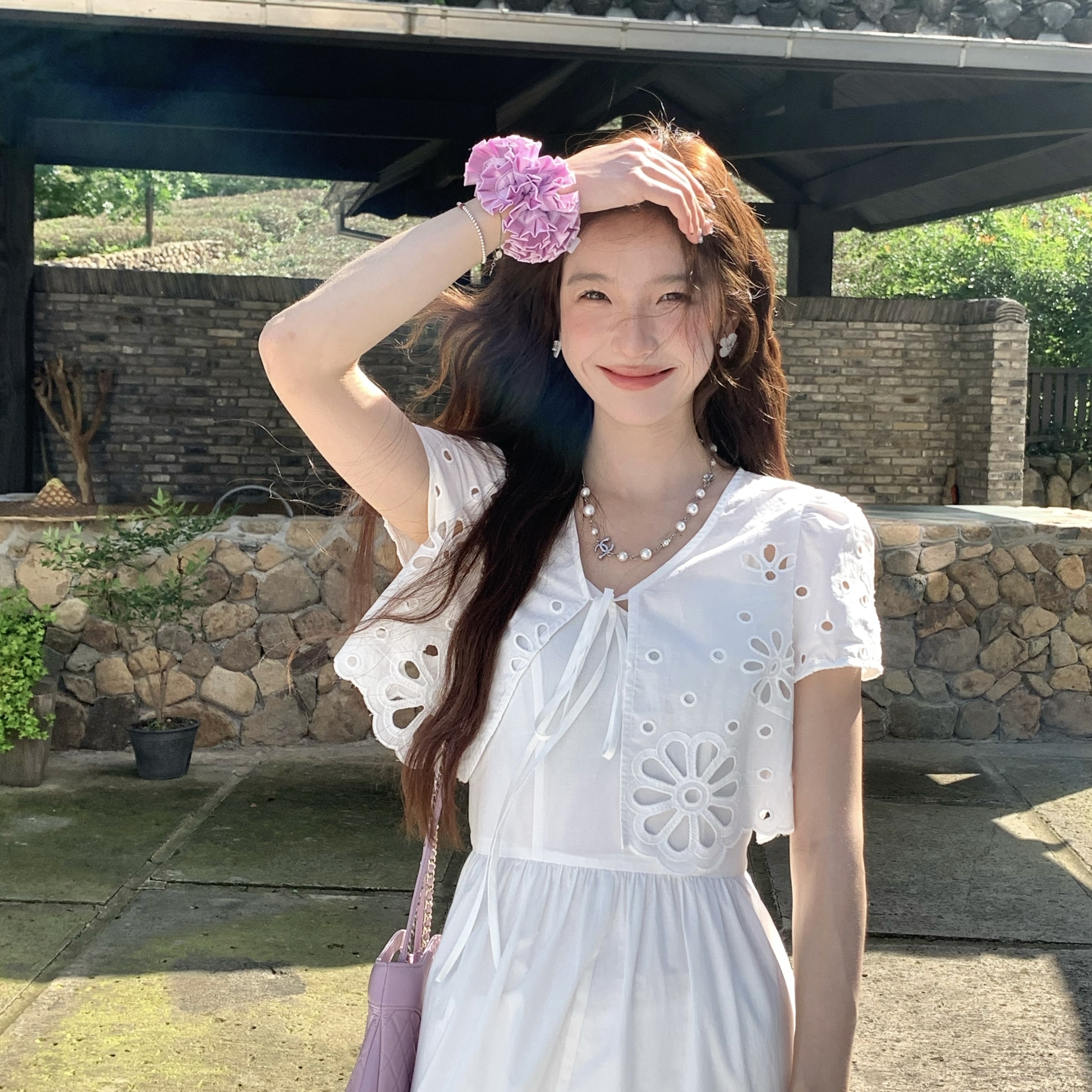 陳十五25夏【浪漫假期】白色V領鏤空刺繡系帶小上衣吊帶裙套裝
