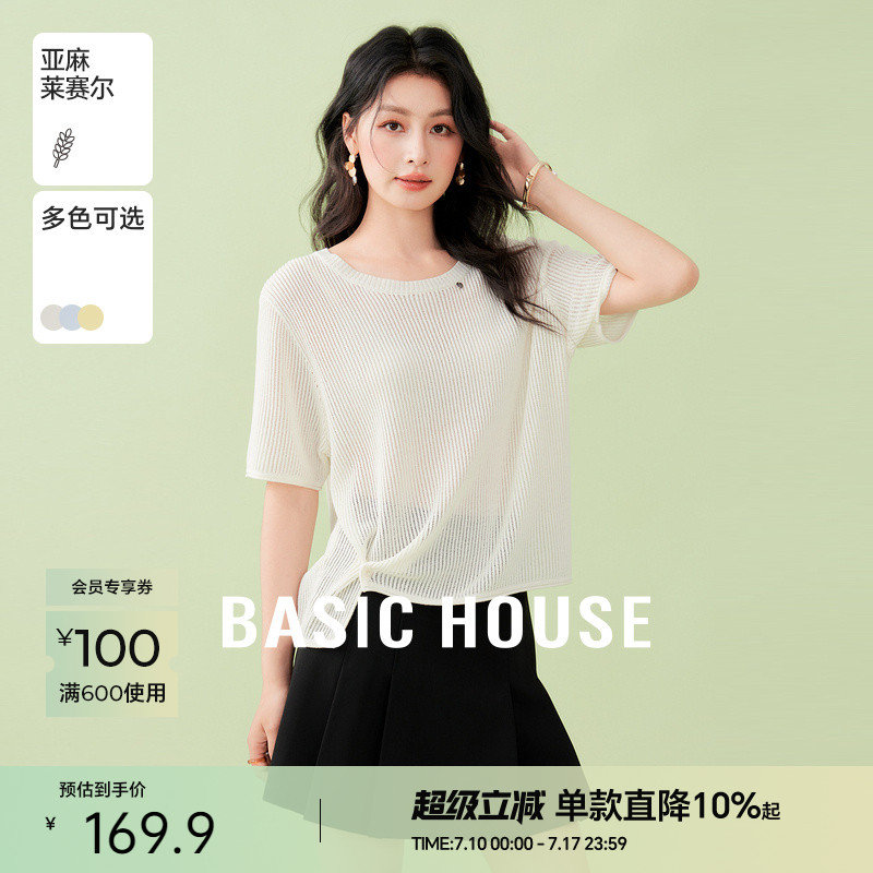 Basic House/百家好開叉短袖針織衫夏新款短款顯瘦萊賽爾寬松上衣