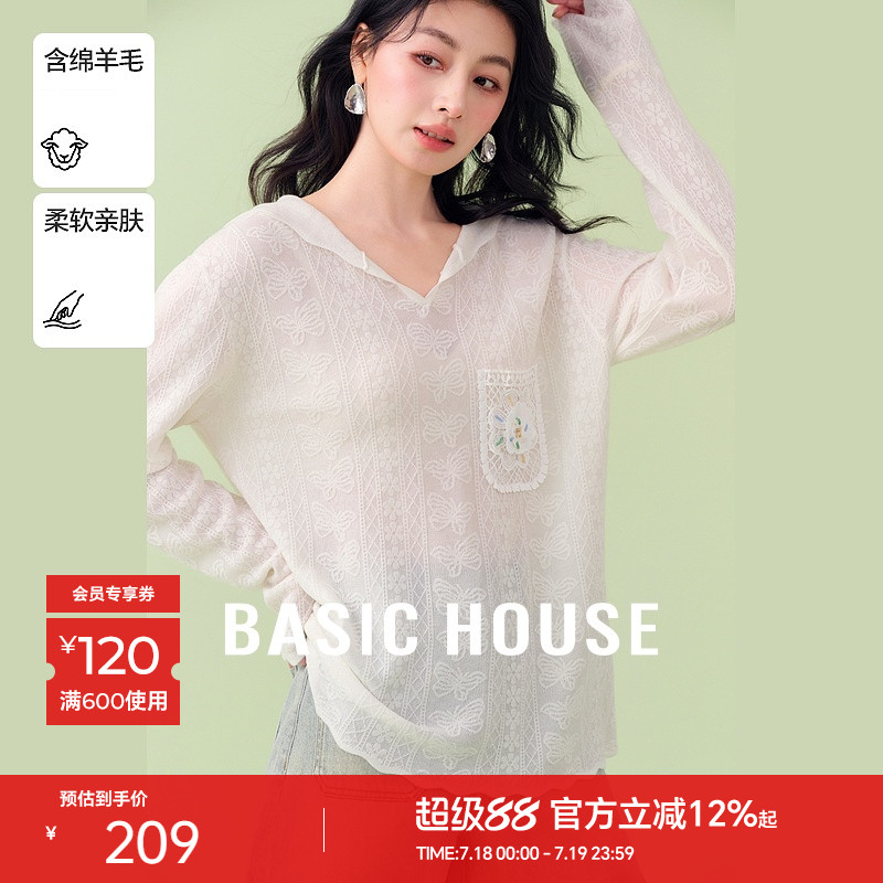 Basic House/百家好韓系連帽蕾絲針織衫春季綿羊毛花邊套頭上衣女