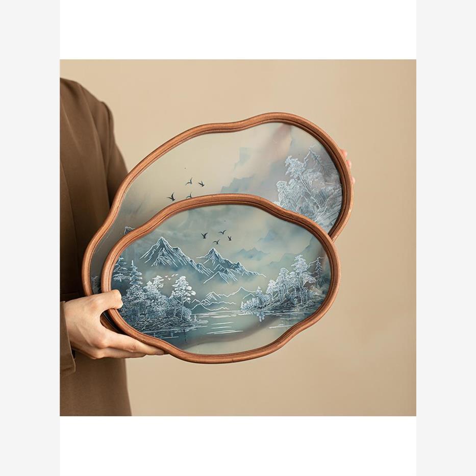 新中式山水竹制玻璃茶盤家用喝茶茶具托盤輕奢高檔放茶杯水杯托盤