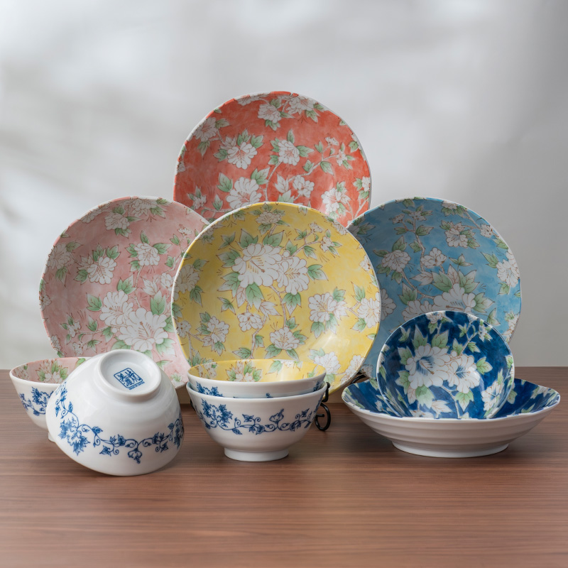 美濃燒日式木槿花碗盤十件套進口釉下彩平盤深盤清新家用餐具套裝