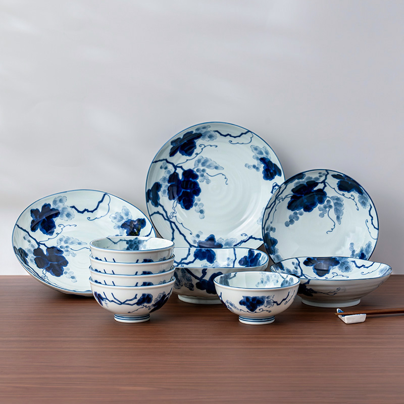 美濃燒染付葡萄米飯碗盤餐具套裝日式家用大盤進口釉下彩10件套