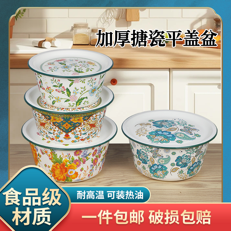 搪瓷盆帶蓋食品級加厚琺平蓋瓷盆碗家用廚房豬油碗可加熱熬中藥盆