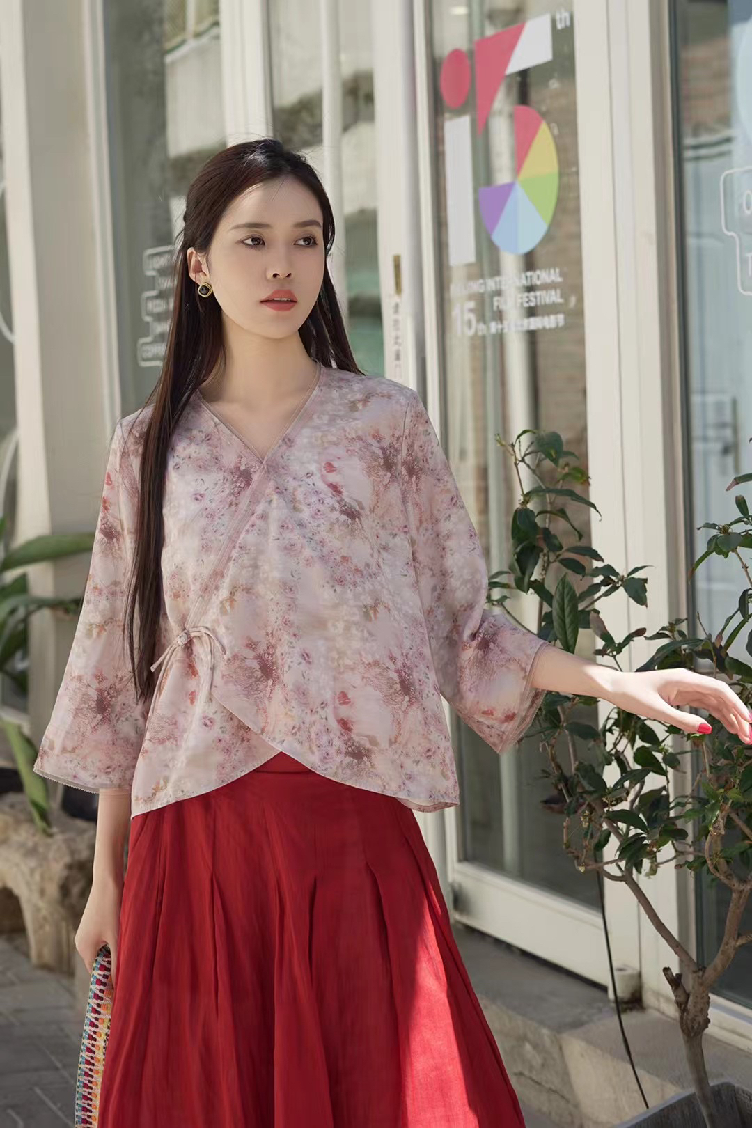 【外貿處理】賠錢甩賣新中式國風印花斜襟上衣半身裙小清新兩件套