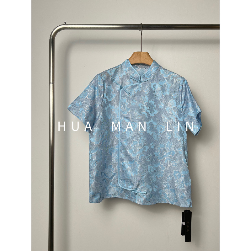 【花滿林 】小立領斜門襟盤扣異色織花羅真絲桑蠶絲短袖上衣2331