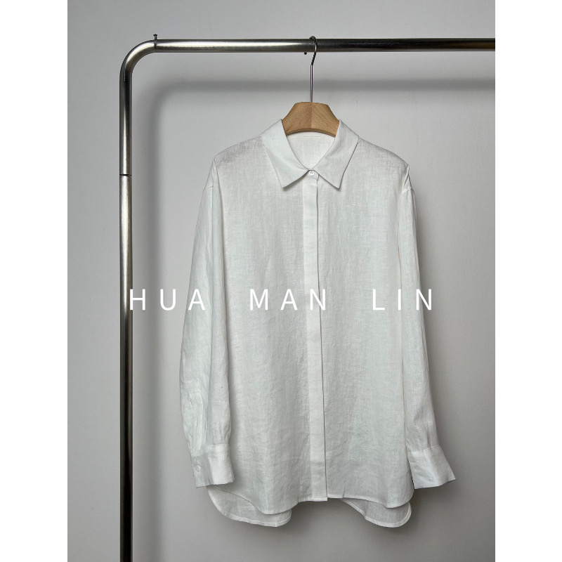花滿林‘男友風’翻領定染色漢麻白色長袖氣質上衣2935