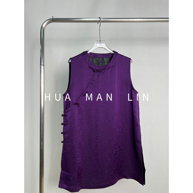 【花滿林】圓領斜門襟盤扣35MM重緞香云紗桑蠶絲無袖上衣259694