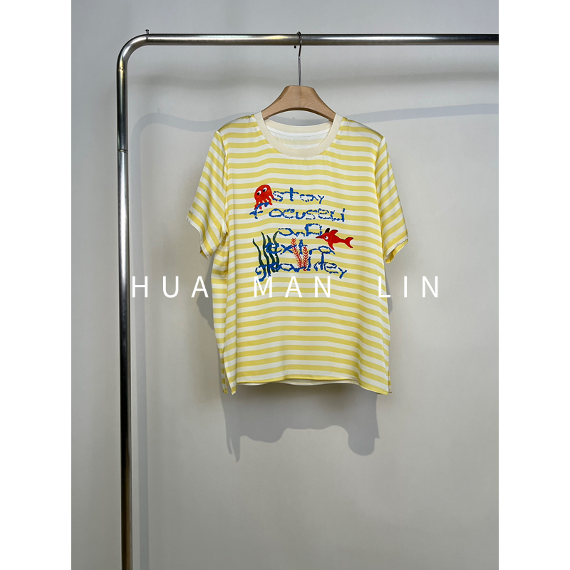 【花滿林】圓領螺紋條紋字母海洋雙喬桑蠶絲短袖上衣251248