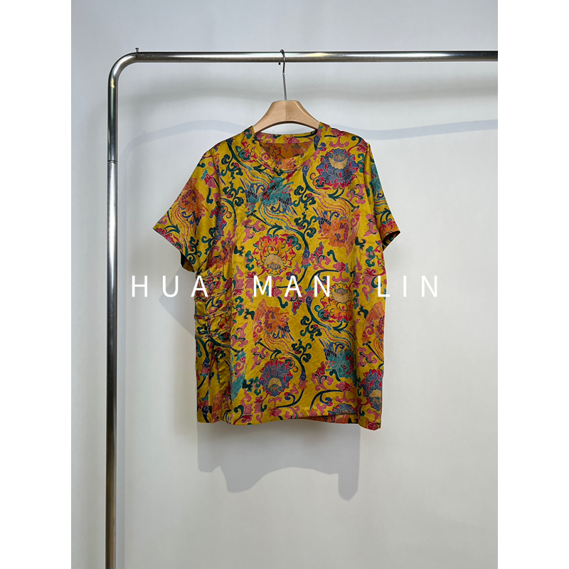 【花滿林】圓領后一??鄱ㄖ乒跇房U真絲桑蠶絲短袖上衣251186