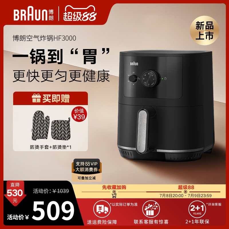 Braun/博朗新款空氣炸鍋4.3L多功能家用小型免翻面電烤箱HF3000
