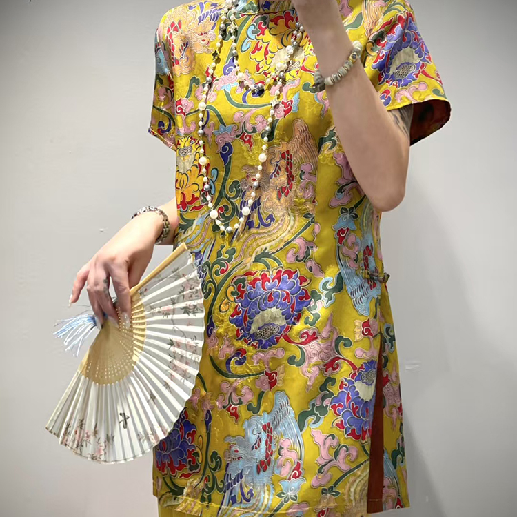 2025年夏季新品時尚氣質金絲提花香云紗品質真絲喜慶中長款旗袍裙