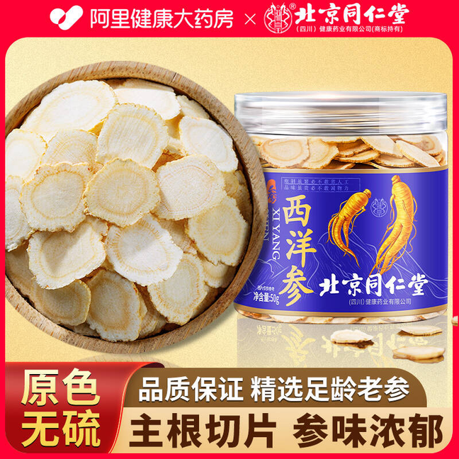 北京同仁堂西洋參片官方旗艦店切片含片人參中草藥材泡水喝搭黃芪