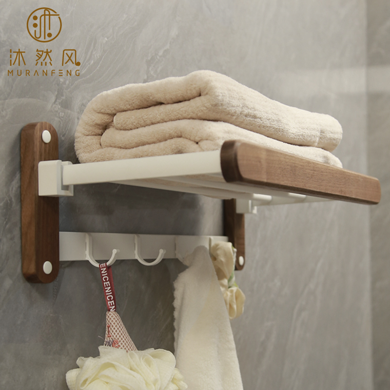 小戶型衛生間浴室可免打孔實木折疊浴巾架置物架壁掛毛巾收納掛架