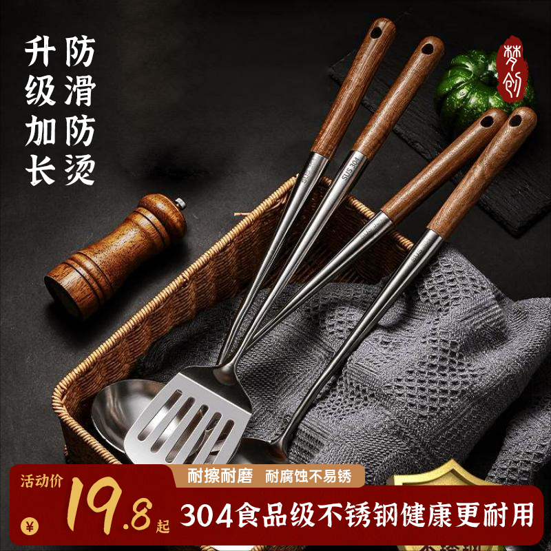 304不銹鋼鍋鏟家用加厚炒菜鏟子廚具套裝漏勺大湯勺炒勺木柄鐵鏟