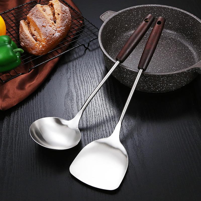 廚房家用復古木柄不銹鋼烹飪炒菜鏟勺兩件套 無磁實木柄廚具套裝