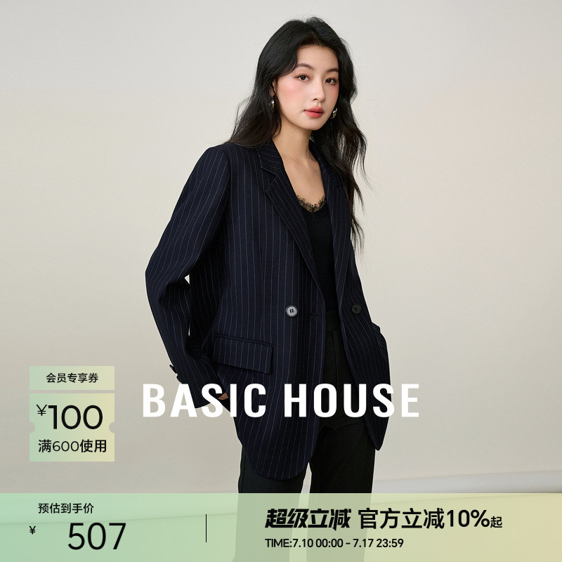 Basic House/百家好韓版翻領細條紋西裝外套寬松短款西服上衣春季