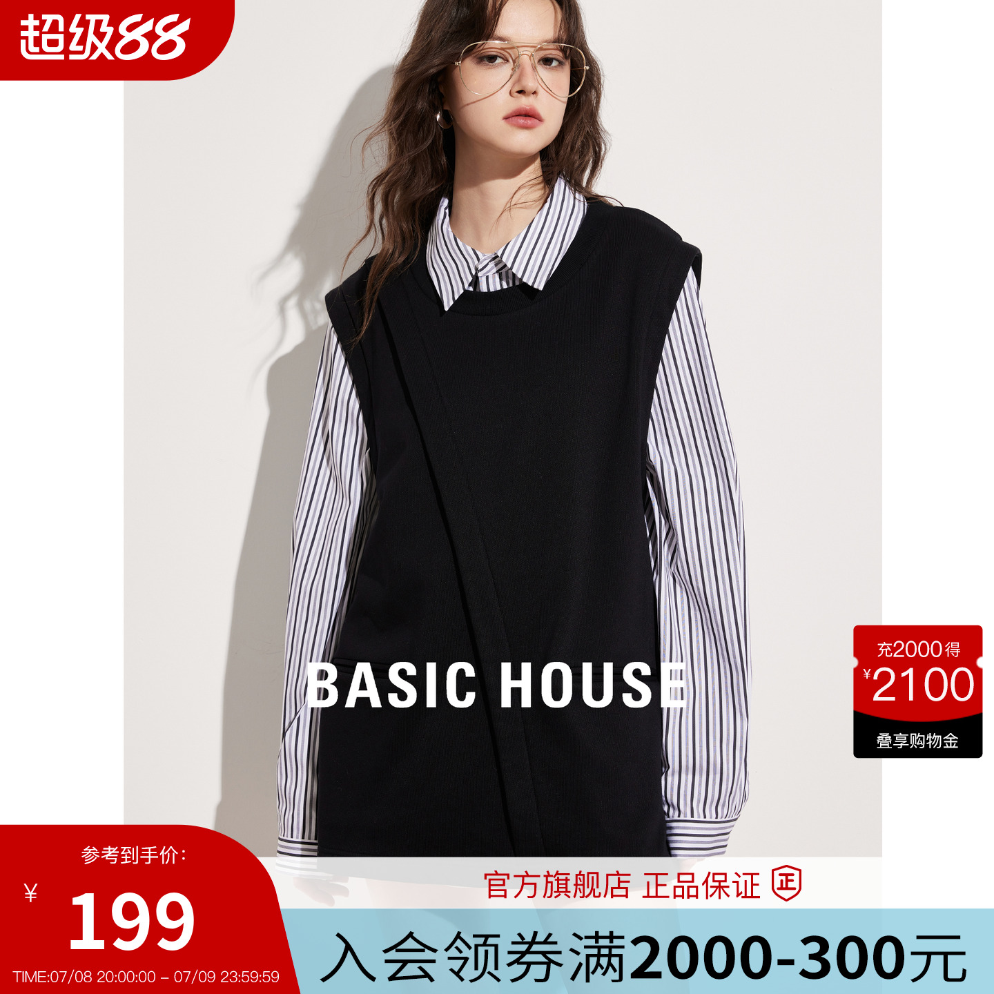 Basic House/百家好通勤條紋翻領襯衫女2025春季拼接顯瘦無袖衛衣