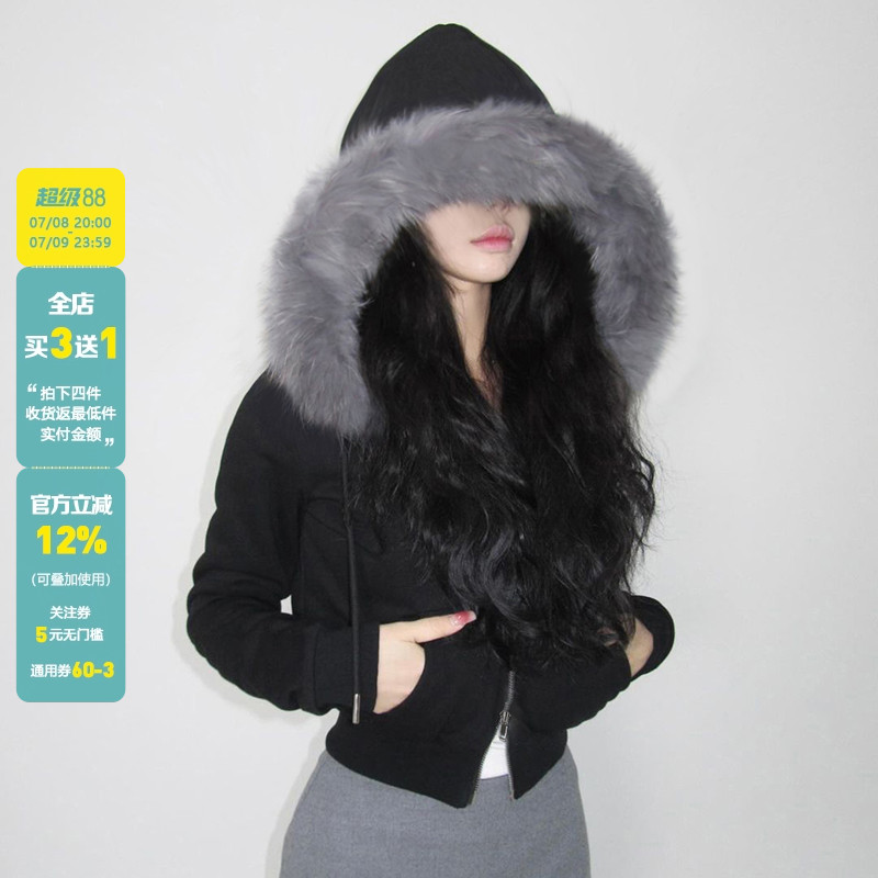 WEEKEEP 毛毛連帽加絨加厚百搭衛衣女秋冬顯瘦開衫休閑短外套上衣