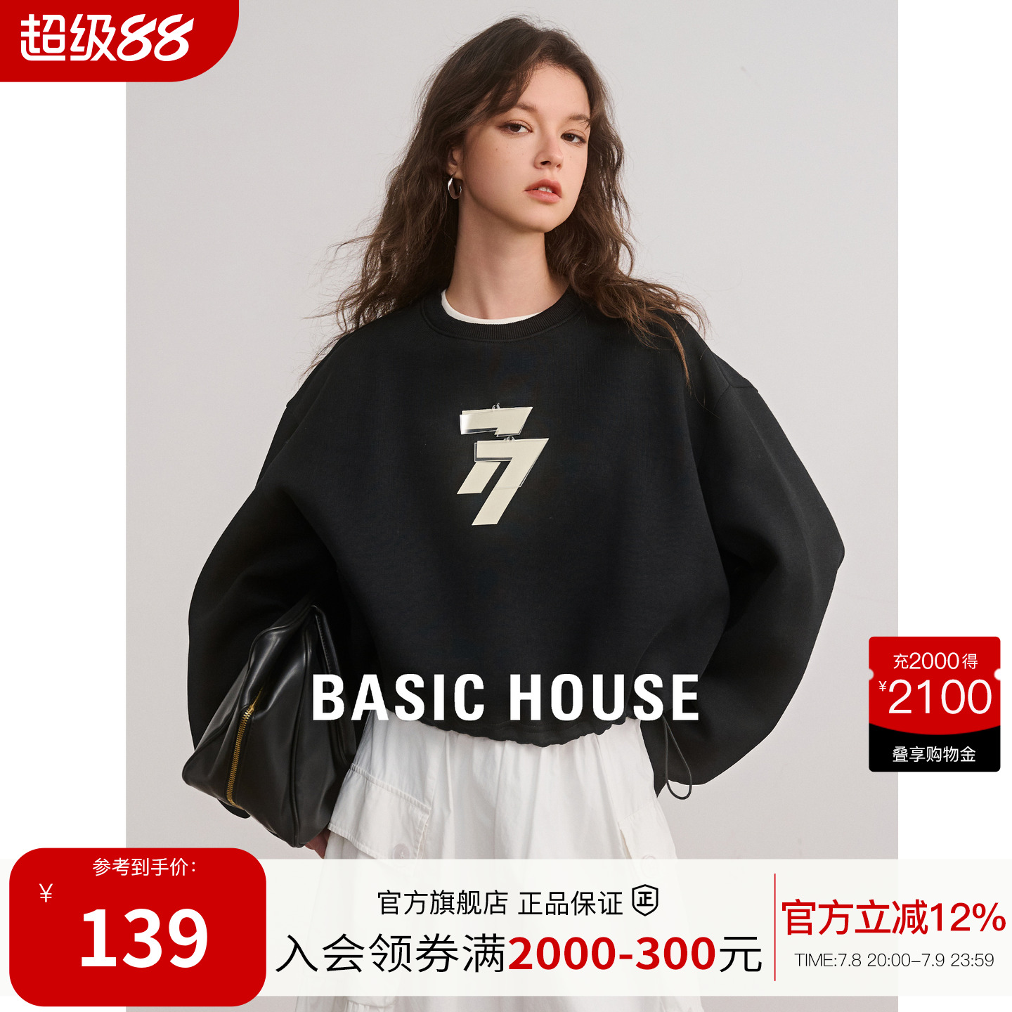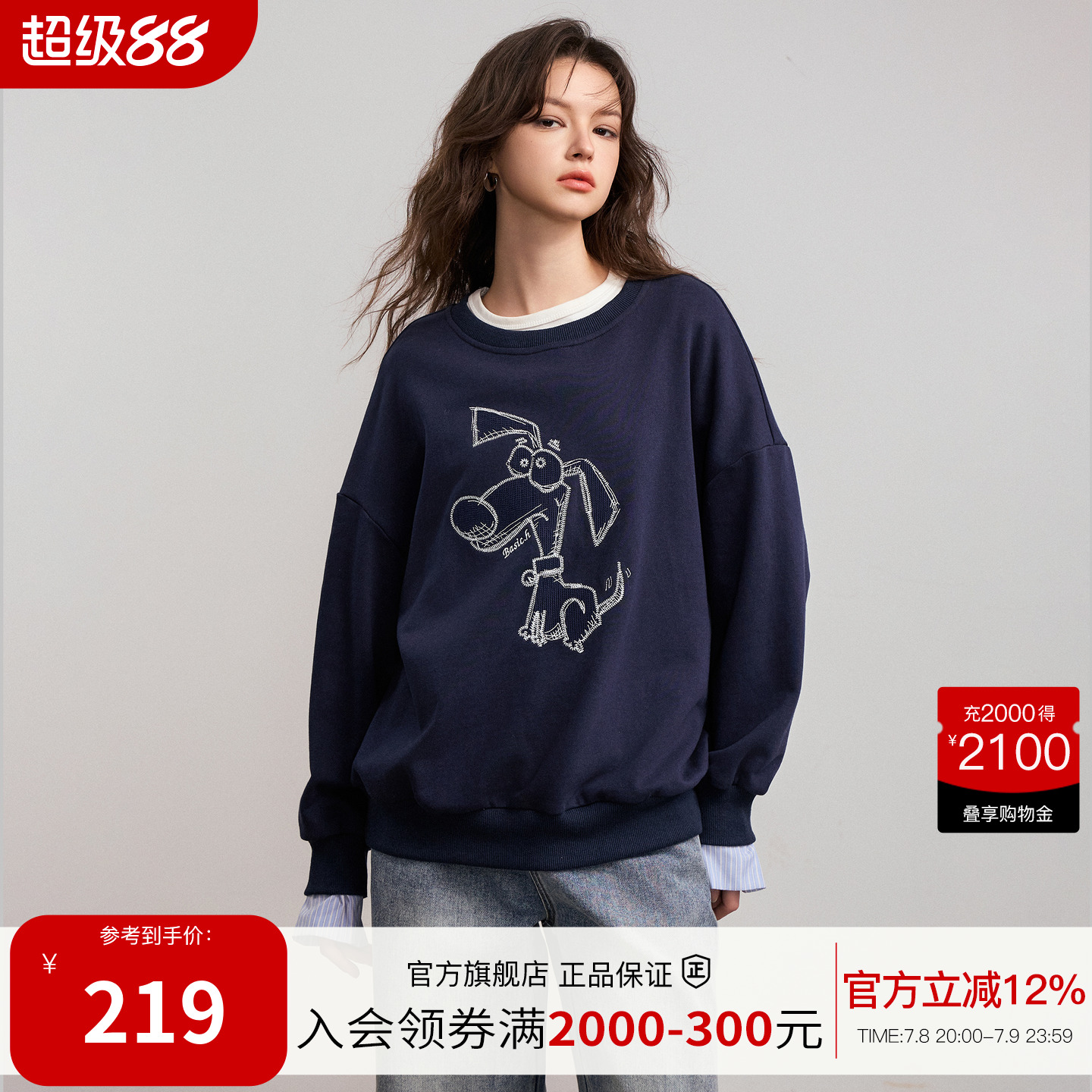 Basic House/百家好韓系卡通刺繡印花圓領衛衣女2025春季慵懶上衣