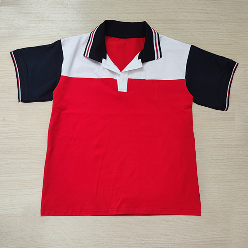 白色拼大紅色校服短袖藏藍領上白紅白條男女通用T恤班服POLO衫夏