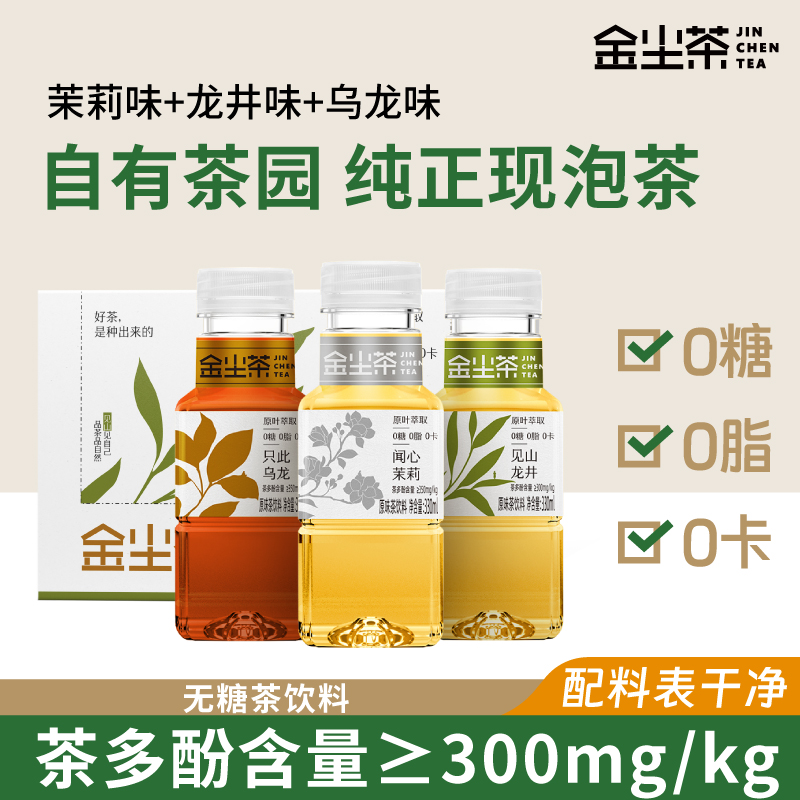 金塵茶無糖烏龍茉莉花茶龍井茶0糖0脂0卡飲料整箱330ml*12瓶