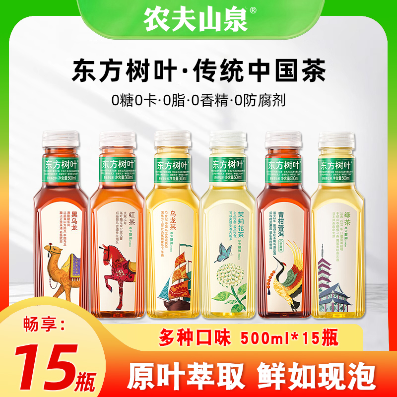 農夫山泉東方樹葉茉莉花茶500ml*15瓶整箱青柑普洱無糖烏龍茶飲料