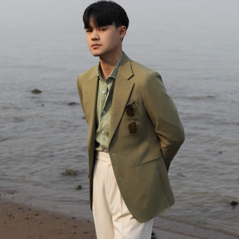 意式那不勒斯高品質淺綠色單排扣米蘭眼抗皺清新休閑修身西裝外套