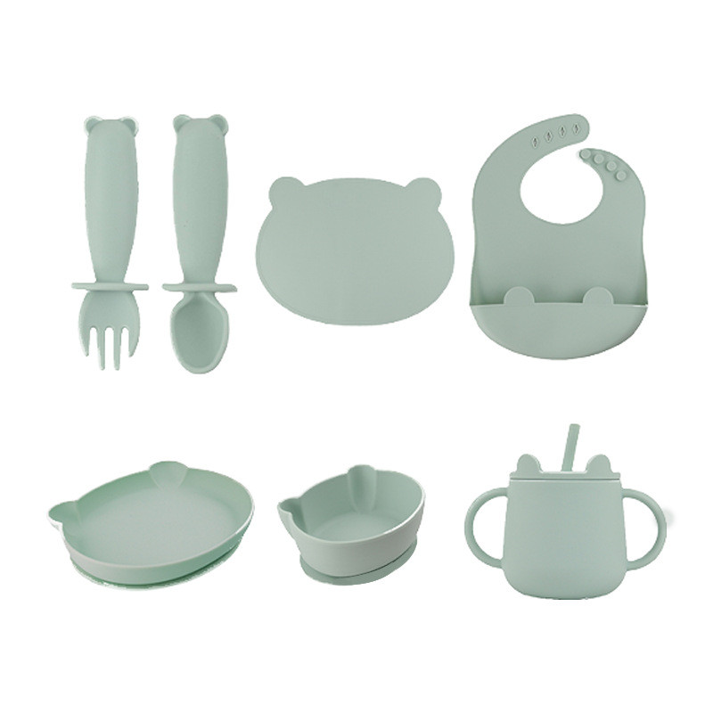 兒童餐盤餐具圍兜圓碗硅膠帶蓋勺叉7件套防摔硅膠兒童餐具套裝