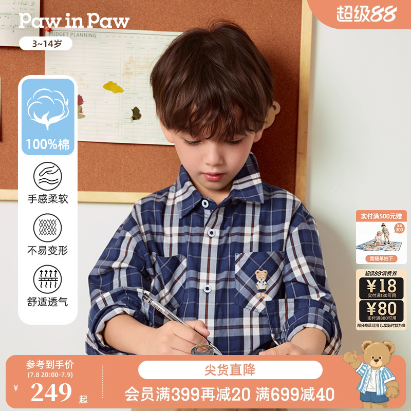 PawinPaw卡通小熊童裝25年秋冬新款男童寬松格子襯衫全棉舒適