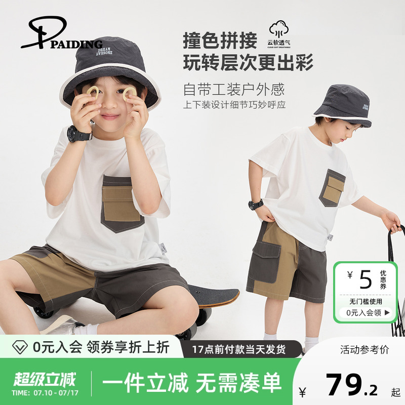 PAIDING童裝男童套裝兒童夏季撞色拼接短袖短袖休閑兩件套男大童