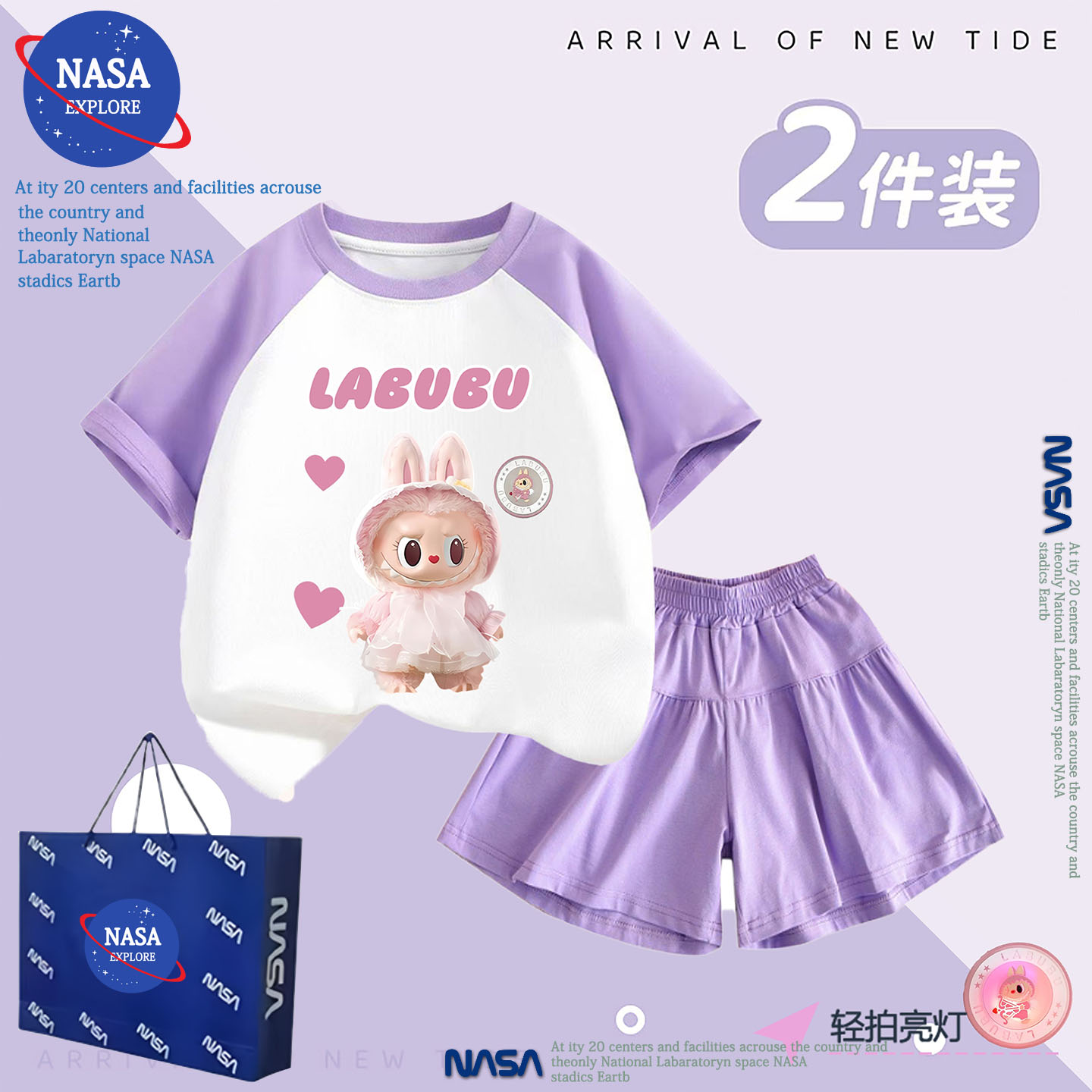 NASA女童labubu拉布布兒童裝純棉短袖褲裙套裝夏季女孩亮燈兩件套