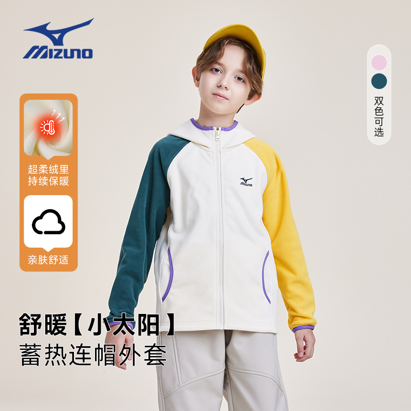 Mizuno美津濃兒童搖粒絨連帽外套保暖拼接撞色秋冬新款男女中大童