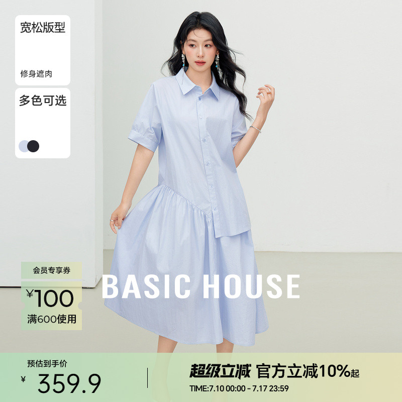 Basic House/百家好淡人純色翻領連衣裙2025夏季設計感中長款裙子