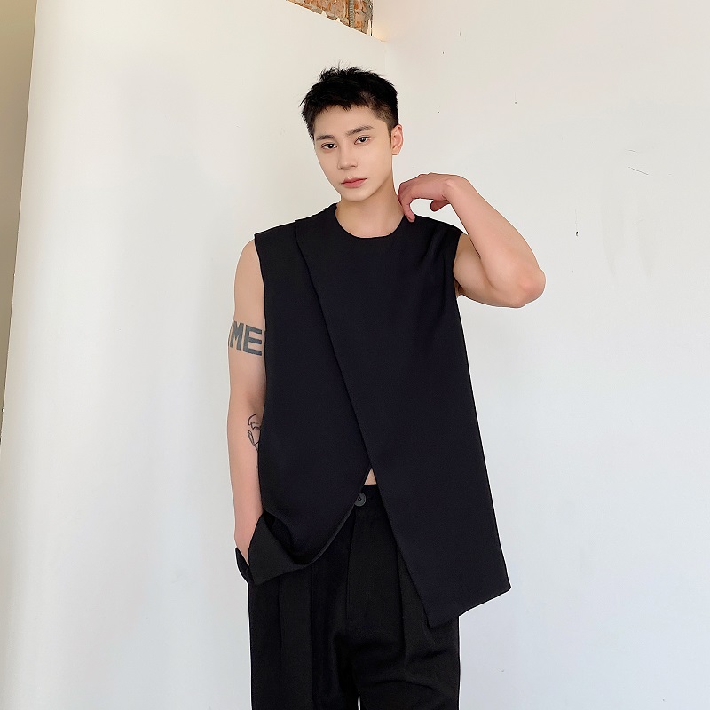 夏季禁欲系暗黑痞帥不規則無袖坎肩馬甲男開衩T恤潮流發型師上衣