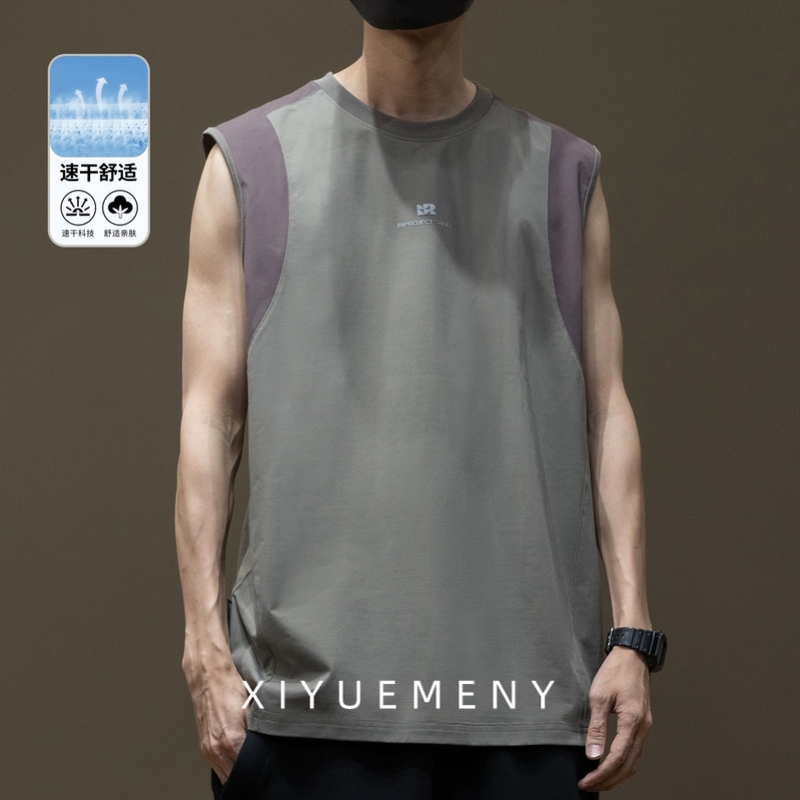 26支科技速干撞色拼接無袖背心男士2025夏季新寬松大碼印花運動衫