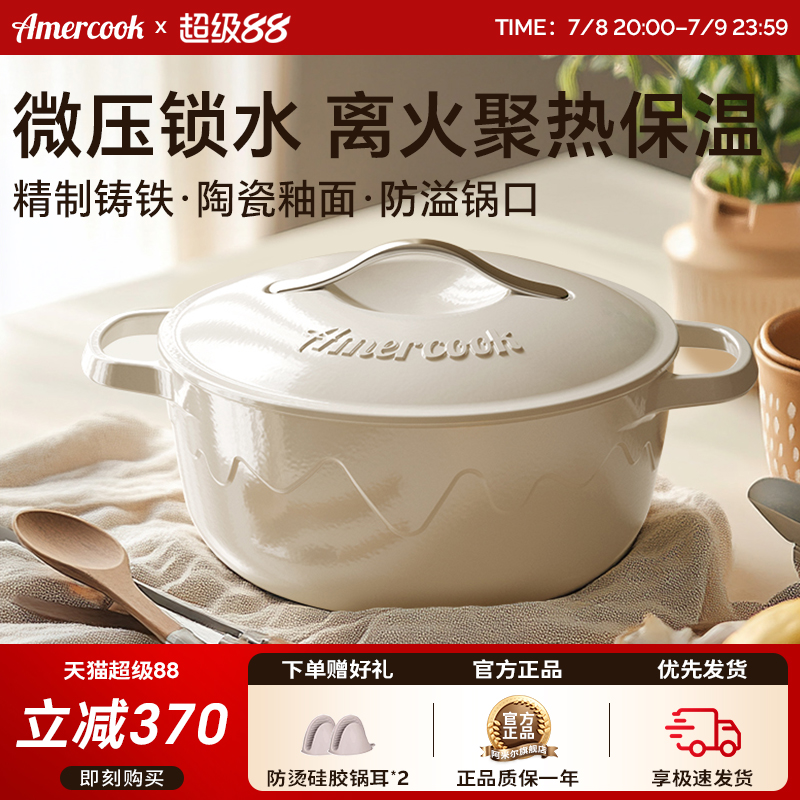 Amercook鑄鐵琺瑯鍋家用燜燉鍋紅色煲湯鍋電磁爐平底砂鍋燉盅煮鍋