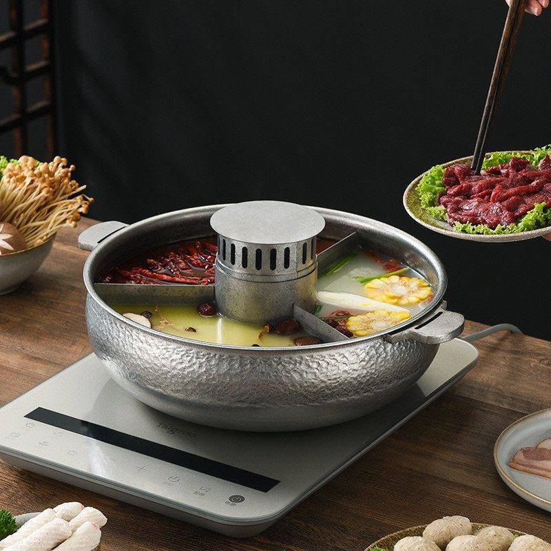 意鉑仕304不銹鋼錘紋鴛鴦火鍋電磁爐燃氣灶通用涮鍋商用無煙鍋