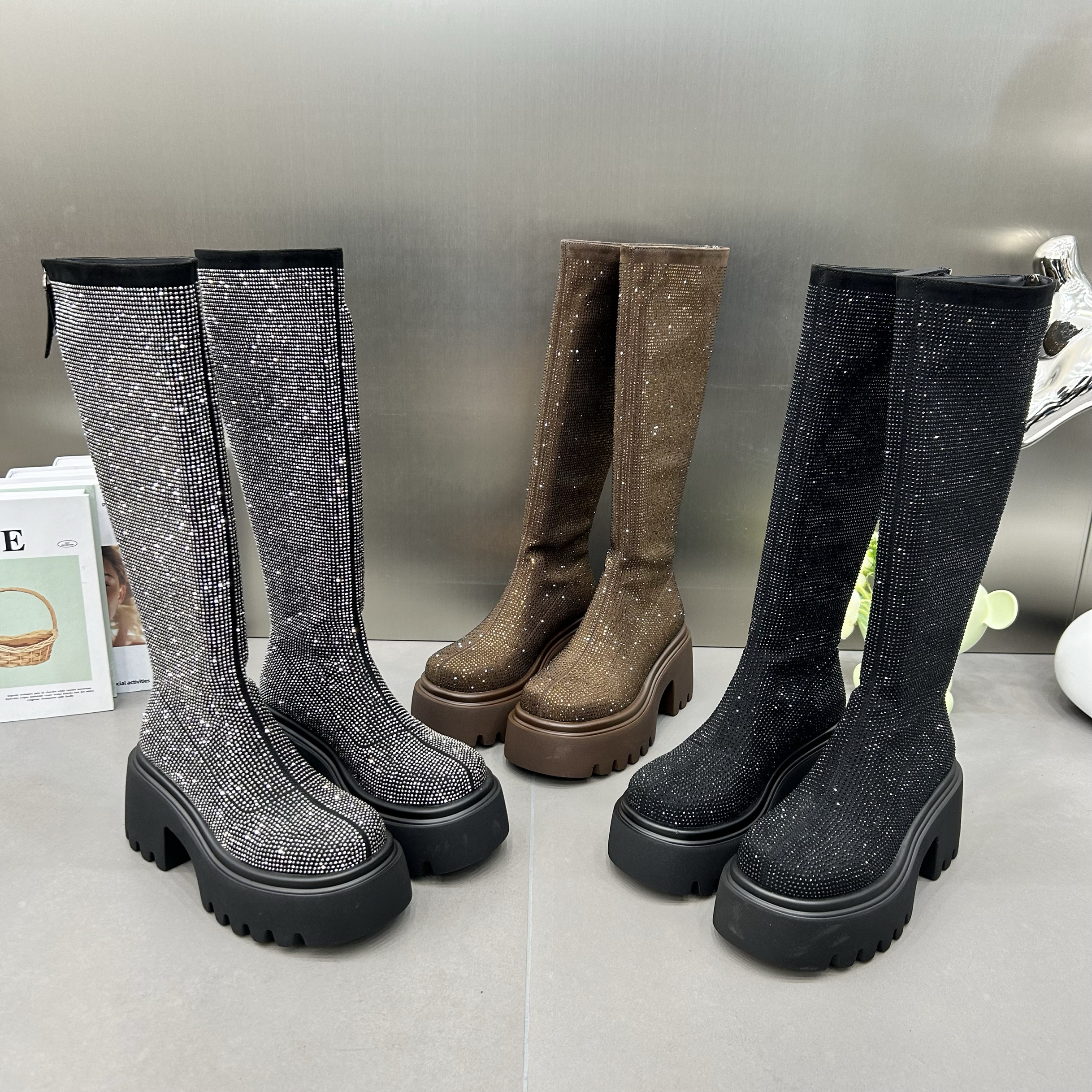 歐貨2025春季新款水鉆8cm厚底長靴女高筒瘦瘦靴粗跟顯瘦騎士靴潮
