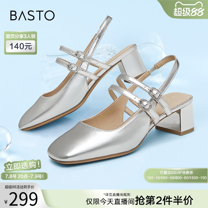 百思圖愛麗絲夏商場新款銀色瑪麗珍涼鞋粗跟后空女涼鞋A3851BH4