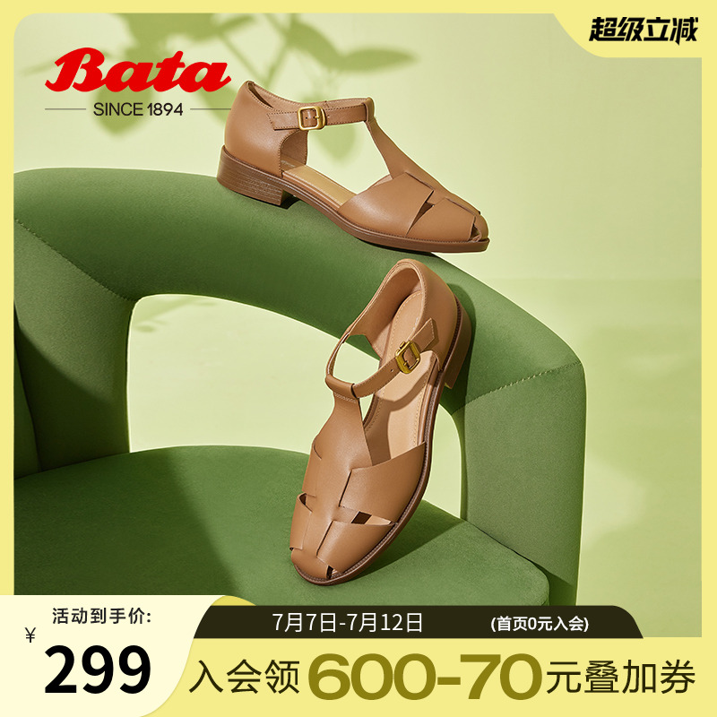 Bata羅馬假日包頭涼鞋女春秋牛皮鏤空復古羅馬鞋ATA27AK4