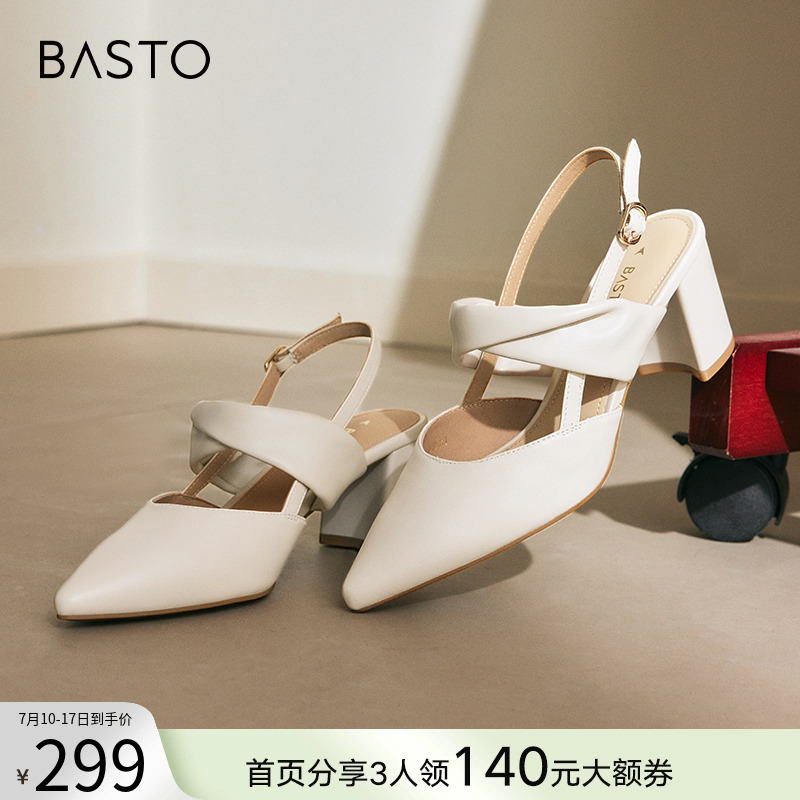 千百度包頭粗高跟時裝涼鞋女夏季新款后空羊皮尖頭半涼鞋通勤百搭